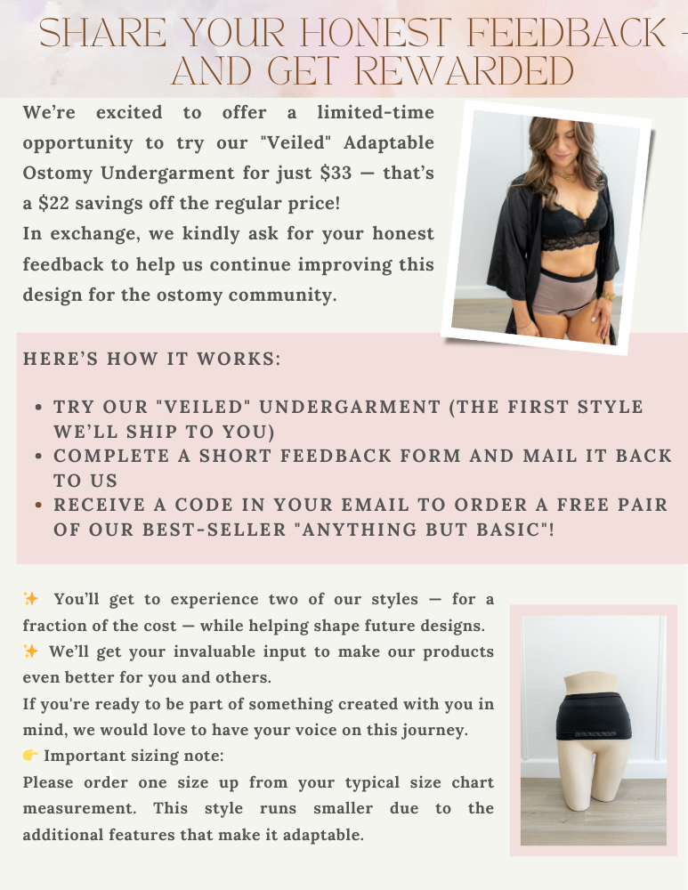 Veiled is a one-piece underwear set that acts as a two-piece underwear set crafted to make you feel beautiful and confident during your most personal moments! This system provides discreteness, peace of mind and comfort to women who have a stoma. The underwear detaches from the crotch area via snap buttons. This section is brought to the back of the underwear and snaps into place on the backside of the garment. Now you have a band, with a pocket inside, that covers and keeps your ostomy bag secure. We offer a variety of sizes and colors to match the variety of skin tones that exist with our users.